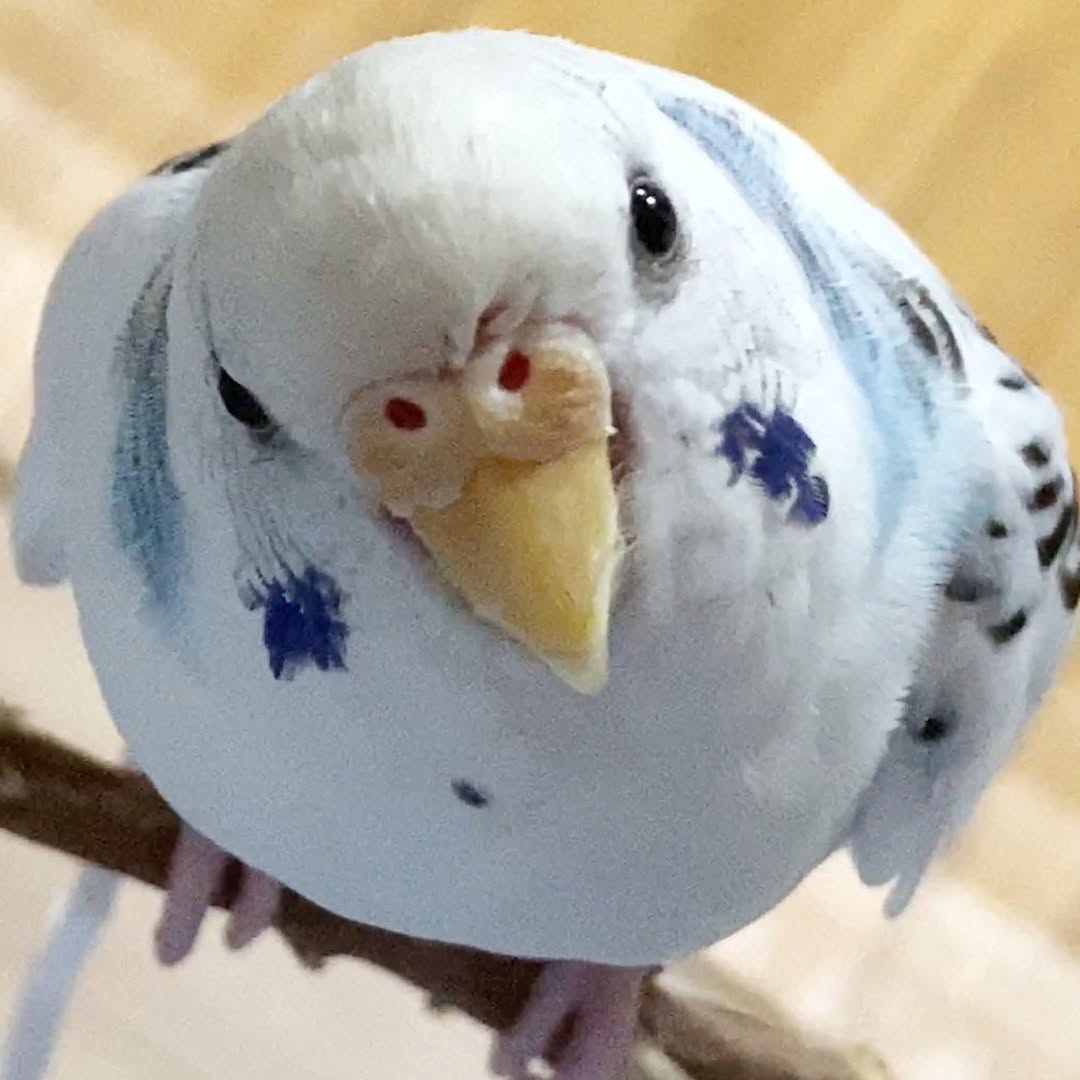 まんまるフォルムのそらちゃんに、キラキラのお目めで上目遣いされたら…もうメロメロ💛 白と水色のハルクインの色合いも相まって、かわいさ爆発です🐥✨